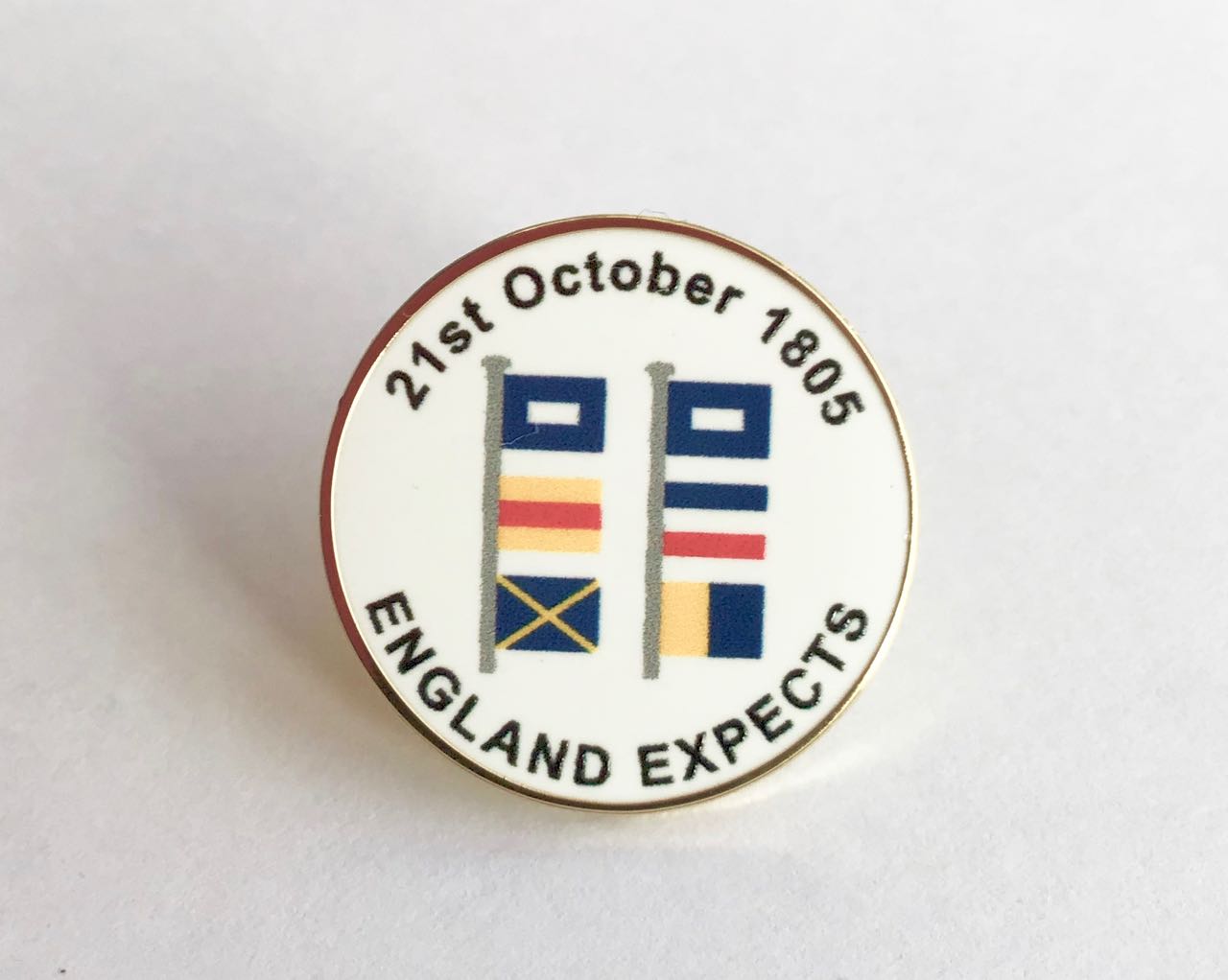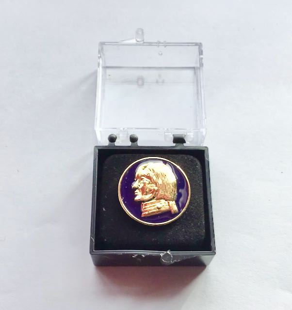 Nelson Society Logo Lapel Pin. Navy Blue with gold coloured surround and society logo. Includes safety catch to secure on garment. (5/8 ” dia)